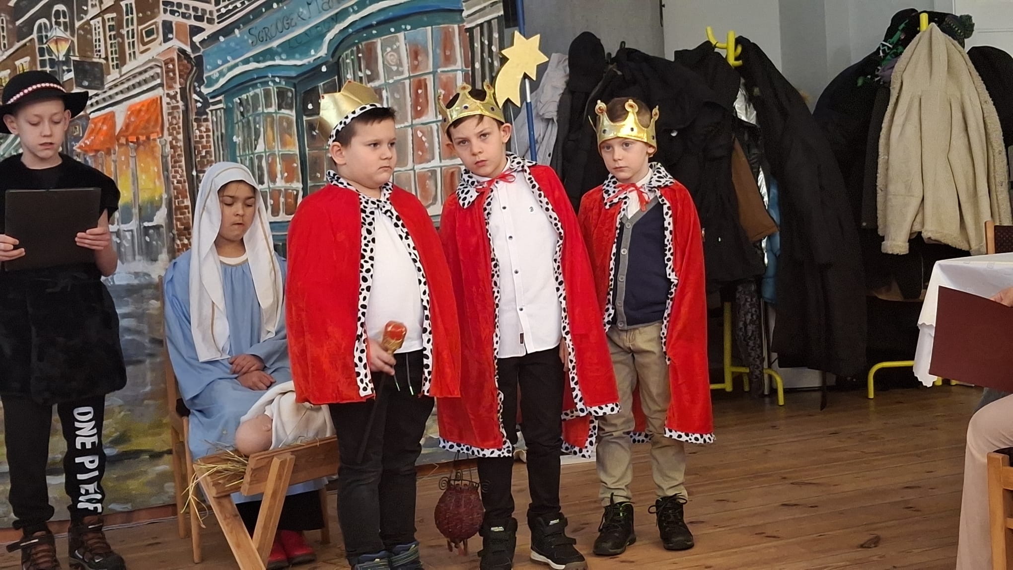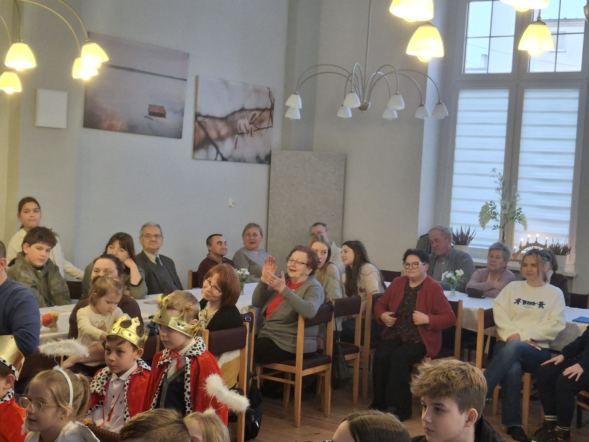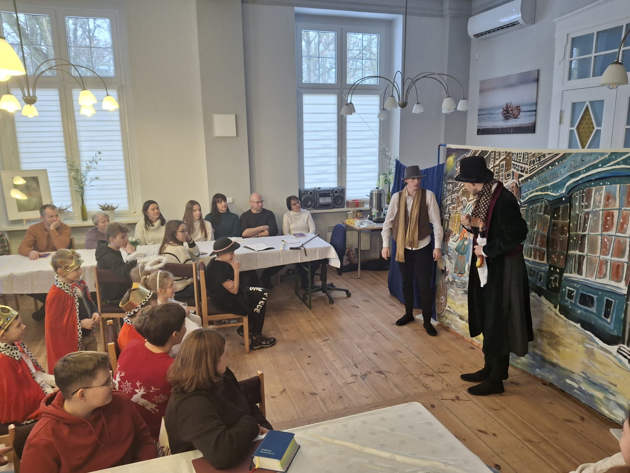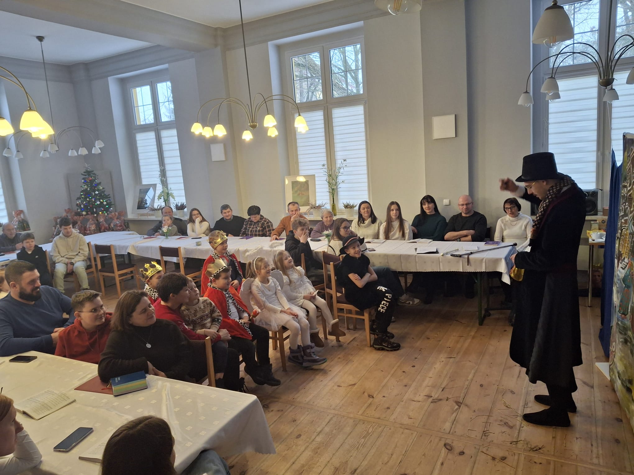 Dwa dni później w Święto Epifanii 6 stycznia br. dzieci miały swoją gwiazdkę, podobnie jak dni kilka temu myło dużo śpiewu, radości, słodkości i prezentów. Spotkanie uatrakcyjnił spektakl dla młodszych i starszych w wykonaniu Teatru Eden z Wieliczki, który przedstawił metodą interaktywną historię Opowieść Wigilijną.